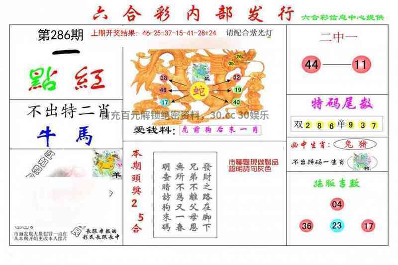 286期:天地+二肖〖天肖+蛇鸡〗开:兔03准 |
